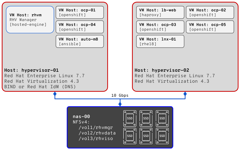 Originally, the physical servers were both running Red Hat Enterprise Linux 7.5 (RHEL), with one configured to provide DNS services for my private lab domain. For the DNS services I chose to use BIND, with the servers setup in a master/slave configuration. While running my own DNS might seem like just some extra nerdy fun, it’s actually a requirement to have fully qualified and resolvable DNS names for Red Hat Virtualization (RHV). As for the original virtualization setup, RHV 4.2 was deployed in self-hosted engine mode with 3 separate networks (mgmt, VM traffic, and storage). In short, self-hosted means that the management engine is configured and then deployed as a virtual machine on the virtualization platform itself. This setup does introduce some complexity, but the benefit is that the manager can move between the two servers. Also, perhaps more important for this environment, it means that I didn’t have to commit one server entirely to acting as manager (and thus, eliminating half my virtualized capacity). The piece that makes the movable manager possible, and also allows for VM migration/movement, is the external storage. On my Synology NAS, I setup 3 storage volumes and made them avaiable via NFS v4 on the 10 Gbps network in the lab. The volumes are for storing the RHV manager data, other virtual machine disks, and ISO images.
